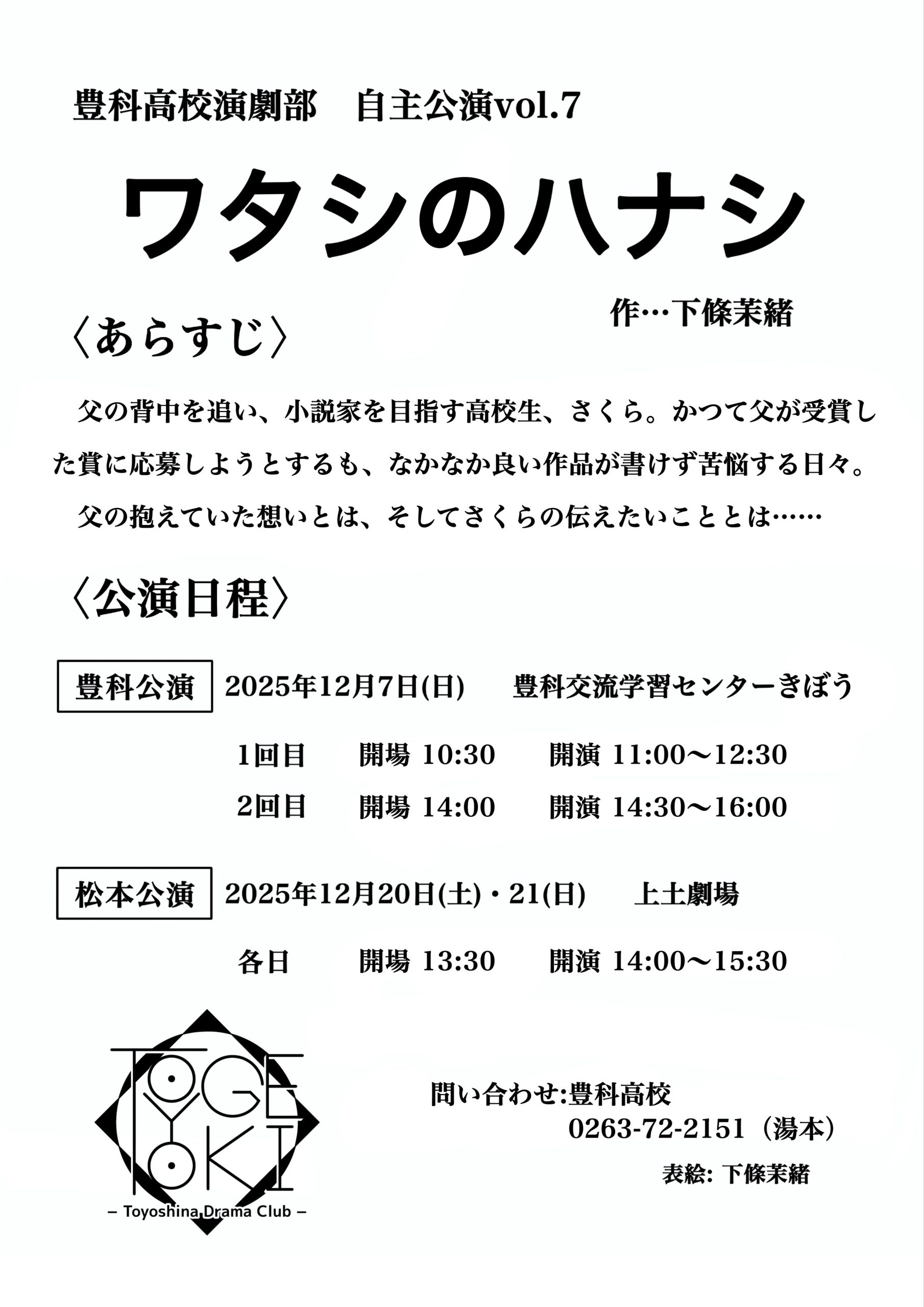 12-20豊科高校演劇部 自主公演「ワタシのハナシ」 2025年11月30日 piccapr NEWS, 演劇公演情報 豊科高校演劇部自主公演vol.7 『ワタシのハナシ』 松本公演 上土劇場(旧ピカデリーホール) 12月20日(土) 12月21日(日)各日14:00〜 お問い合わせ 0263-72-2151 (湯本) ツイート