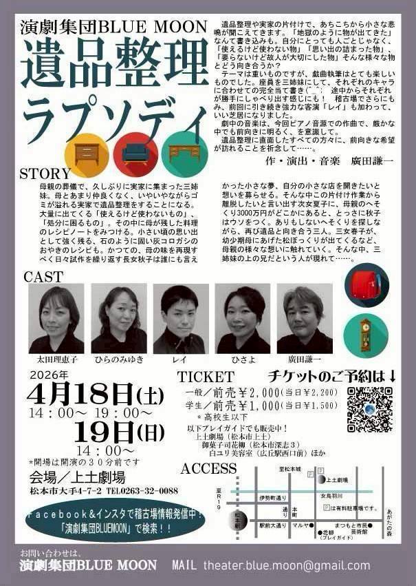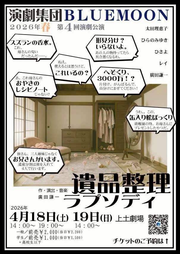 4-18.19演劇集団BLUEMOON第4回公演「遺品整理ラプソディ」 2026年3月23日 piccapr NEWS, 演劇公演情報 2026年春 演劇集団BLUEMOON第4回公演 【遺品整理ラプソディ】 作・演出・音楽 廣田謙一 4/18(土) 14時〜 19時〜 4/19(日) 14時〜 上土劇場 一般¥2000(当日¥2200) 学生¥1000(当日¥1500) ※高校生以下 ↓予約フォームは↓こちらです↓ https://www.quartet-online.net/ticket/ihinseiri ツイート